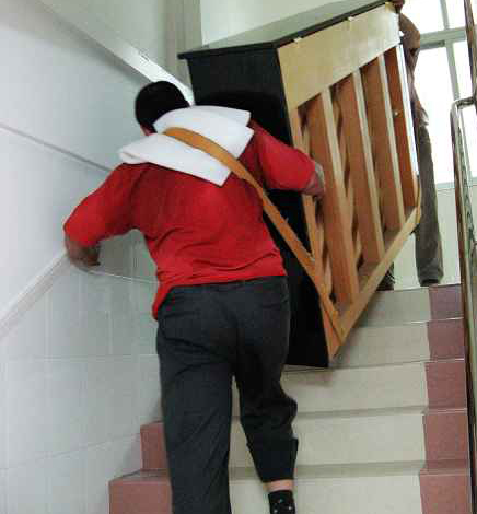 4、如果鋼琴要搬上樓,最好也要有四至五個人。首先要保證搬琴人的安全,同時鋼琴不能碰撞、劃蹭,外表的保護重于內(nèi)部。鋼琴的背面朝墻壁,鍵盤朝樓梯的扶手。兩人在下,三人在上,最好用寬布帶挎在肩上兜住鋼琴的車腳。同時用手抓住琴背的把手和鍵盤底下(不能拉鋼琴的腿),抬起鋼琴一鼓作氣搬上一層樓再休息。特別要注意的是,鍵盤的一側(cè)不能碰扶手,車腳不能碰樓梯。到一層樓面拐彎時要當(dāng)心碰撞、調(diào)整好方向然后再抬起往上搬。進房門時,也要當(dāng)心蹭著門框,保證最后安全地把鋼琴放到安排好的位置上。